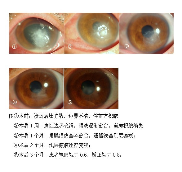 該手術(shù)是應(yīng)用光化學(xué)原理,僅是微創(chuàng)手術(shù),術(shù)后反應(yīng)小,術(shù)者痛苦少。謝某的配合,讓手術(shù)進(jìn)行得很順利。術(shù)后1月,廈門(mén)眼科中心進(jìn)行隨訪(fǎng),謝某的潰瘍基本愈合,術(shù)后3個(gè)月,謝某的裸眼視力0.6,矯正視力0.8。手術(shù)的成功不僅為謝某保住了眼球,而且視力恢復(fù)狀況良好,這讓謝某心中充滿(mǎn)對(duì)廈門(mén)眼科中心的感激,連連說(shuō)謝謝。
