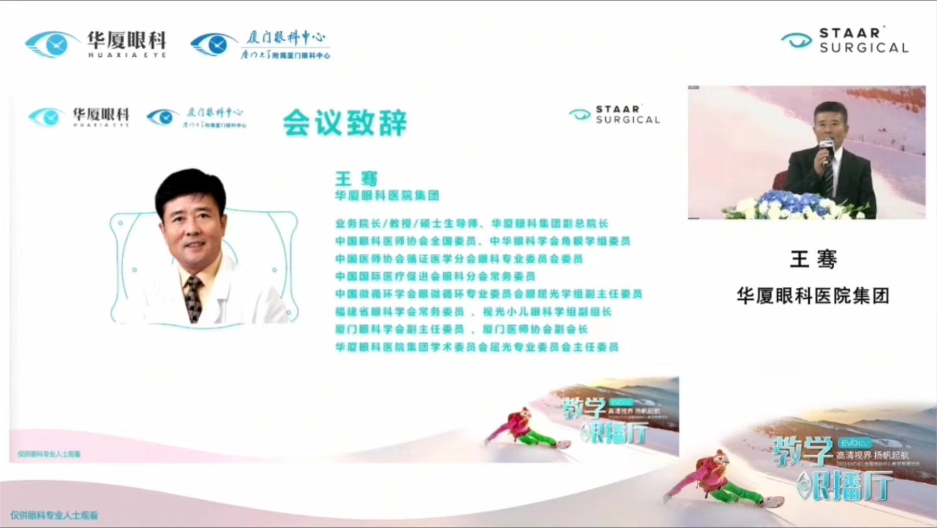 會(huì)議伊始,廈門眼科中心業(yè)務(wù)院長(zhǎng)王騫教授發(fā)表開(kāi)場(chǎng)致辭。他提到,讓患者擁有高清視界,是我們每位眼科醫(yī)生追求的目標(biāo),希望通過(guò)教學(xué)眼播廳活動(dòng),將手術(shù)規(guī)范化、專業(yè)化,提高眼內(nèi)屈光手術(shù)醫(yī)生的專業(yè)素養(yǎng),為更多近視患者帶去福音。