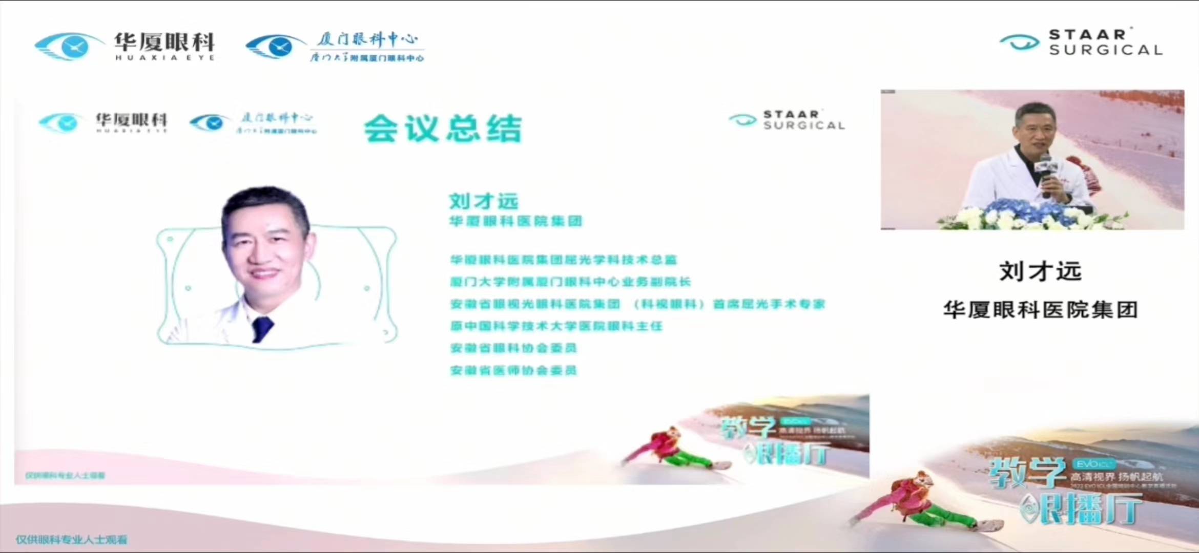 廈門眼科中心業(yè)務(wù)副院長(zhǎng)劉才遠(yuǎn)進(jìn)行了總結(jié)。他表示,通過(guò)教學(xué)眼播廳這種新穎的教學(xué)形式,各ICL手術(shù)專家為我們呈現(xiàn)了一期精彩的教學(xué)課程和振奮人心的手術(shù)直播,使得全國(guó)ICL手術(shù)醫(yī)生有所收獲、有所成長(zhǎng)。我們期待加快青年ICL手術(shù)醫(yī)生的成長(zhǎng),一起推動(dòng)中國(guó)屈光手術(shù)的高質(zhì)量發(fā)展。