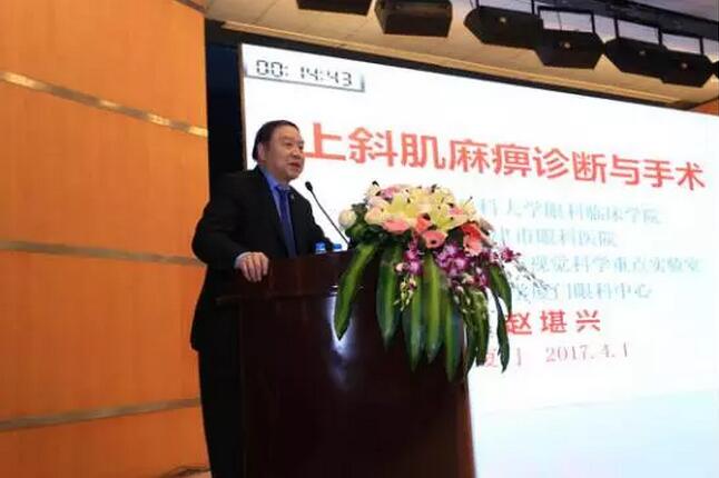 眼科醫(yī)院集團(tuán)專(zhuān)家委員會(huì)主席趙堪興教授帶來(lái)了題為《上斜肌麻痹診斷與手術(shù)》的主題演講。趙教授深入淺出的向大家介紹了SOP的7種臨床分型,并認(rèn)為在治療過(guò)程中需根據(jù)臨床發(fā)展階段、分型,選擇治療方式。趙教授表示垂直、旋轉(zhuǎn)肌肉手術(shù)的非共同性結(jié)果非常明顯,在實(shí)施手術(shù)肌肉的功能位上效果最大,其它注視位矯正效果遞減。