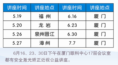 另外,為向廣大近視朋友普及近視防治的常識,廈門眼科中心定期舉辦近視矯治公益講座。具體時(shí)間安排如下:
