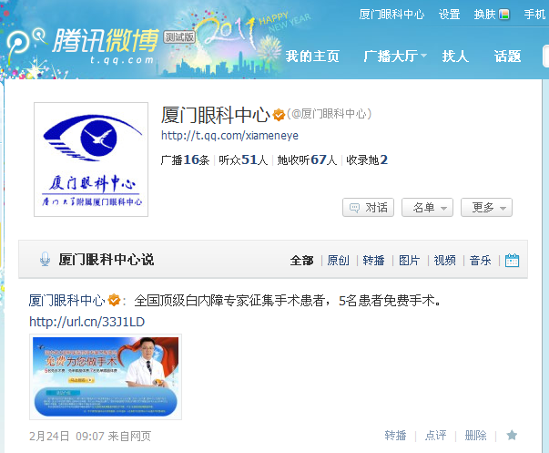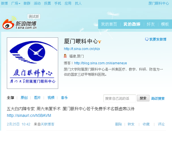 【文章導(dǎo)讀】廈門眼科中心官方微博開通啦!歡迎您加為關(guān)注,獲取眼科中心動態(tài)! 新浪微博: http://t.sina.com.cn/ykzx 騰訊微博: http://t.qq.com/xiameneye