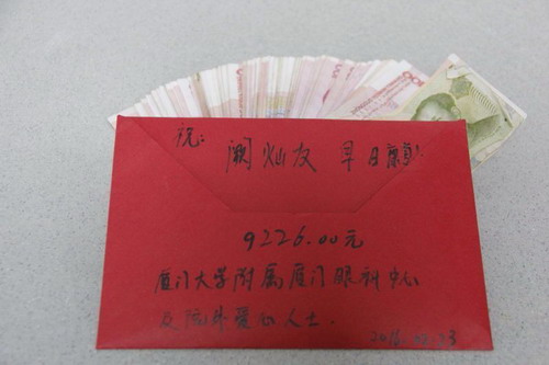 由于小燦寶家境不好,全家九口人,上面有年邁的爺爺奶奶,加上小燦寶兩兄弟,小燦寶媽媽要照顧兩個年幼的孩子無法工作,另外,小燦寶大伯幾年前去世,小燦寶大伯母離家未歸,大伯家的三個孩子也是小燦寶父母代為照顧,九口人只有小燦寶爸爸工作養(yǎng)家。護士梁嘉惠了解到情況后,與護士長陳秋蓮商量在微信朋友圈發(fā)起愛心捐款。經(jīng)過三天募集,一共募集到9926元善款。