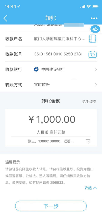 通過(guò)對(duì)公賬戶繳費(fèi)的患者需要標(biāo)注姓名+電話+近視手術(shù)開(kāi)放日。