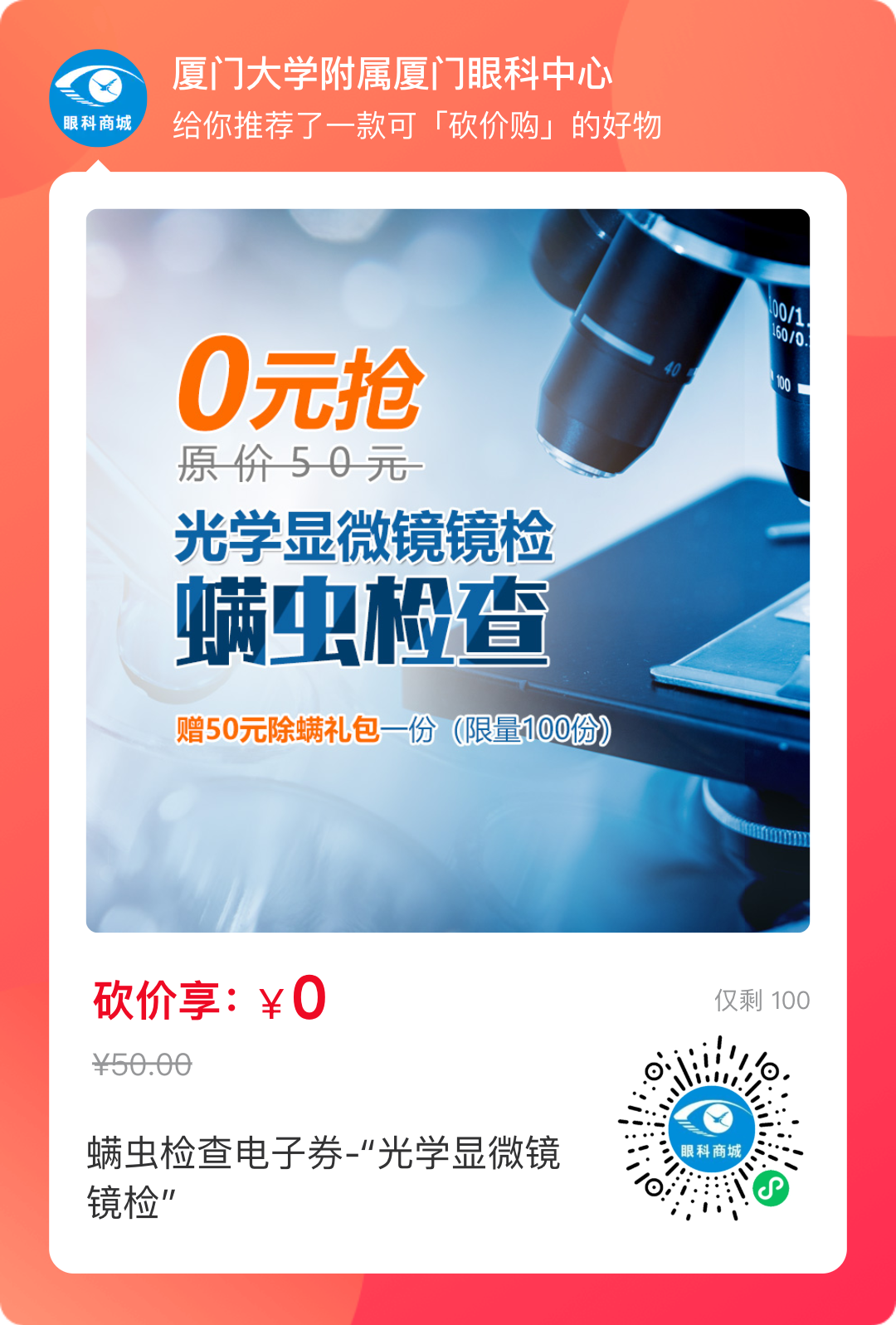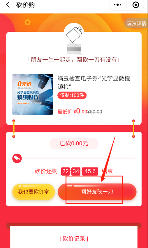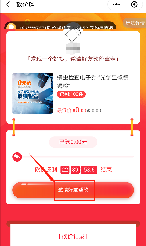 2、邀請(qǐng)10位好友助力砍價(jià),即可0元享螨蟲鏡檢。