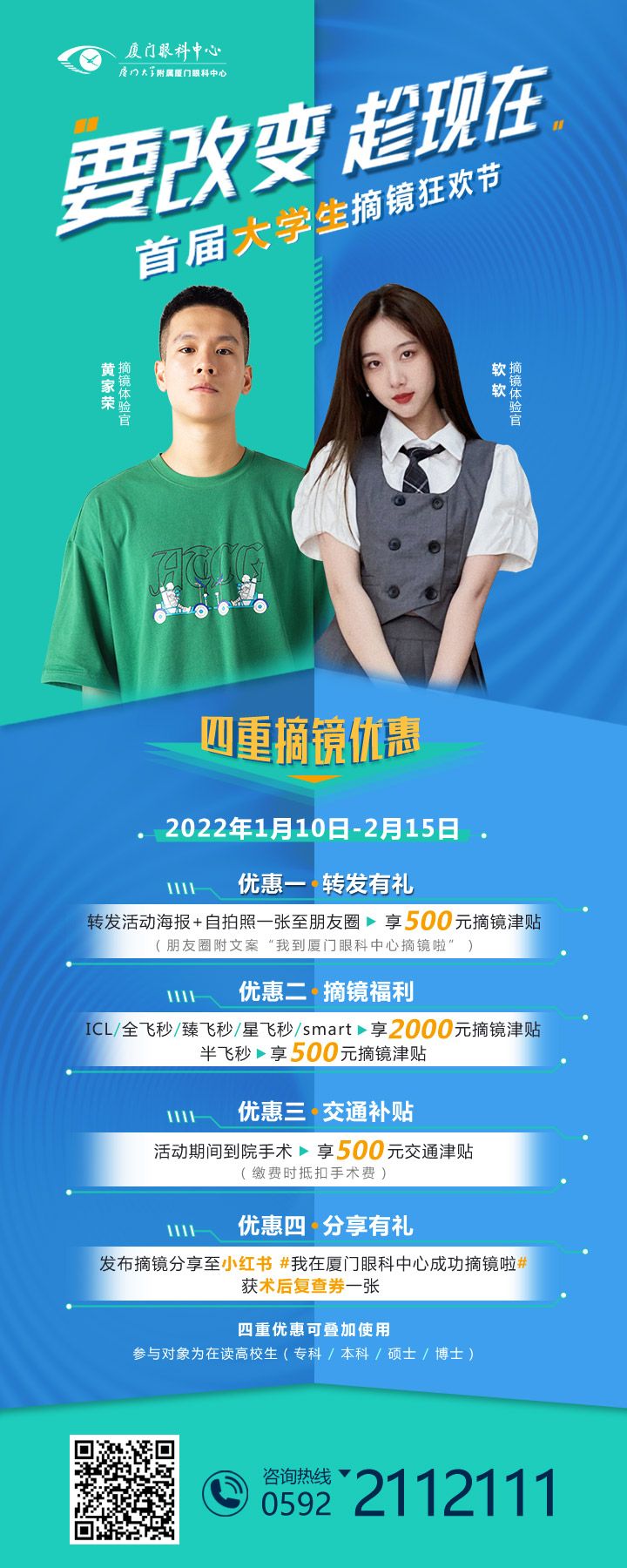 11月30日!白內(nèi)障/老花【文章導(dǎo)讀】2022年1月10日-2月15日 廈門眼科中心 大學生摘鏡狂歡節(jié) 席卷卷卷卷而來 四重摘鏡福利 丟掉眼鏡 丟掉煩惱 要改變 趁!現(xiàn)!在! 讓我們一起做 新時代有才有為有顏值的高知分子吧 活動時間: