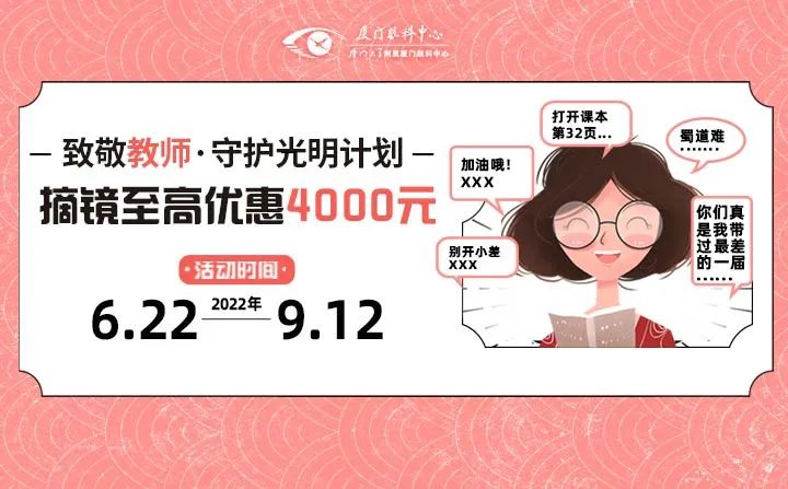福建省教師:4000元摘鏡優(yōu)惠(ICL/全飛/臻飛秒/星飛秒/Smart),2000 元摘鏡優(yōu)惠(半飛秒)。