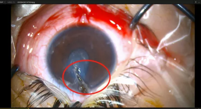 右眼被竹簽戳傷導(dǎo)致角膜穿通傷,右眼已2天不能睜眼,這意味著要立馬進行右眼角膜清創(chuàng)縫合手術(shù),否則患兒將有失明風險。在疫情的特殊時期,李海波博士緊急協(xié)調(diào)各方,開通綠色通道,20:14患兒被送進了負壓手術(shù)室,李海波博士為她進行了全麻下角膜清創(chuàng)縫合手術(shù)。