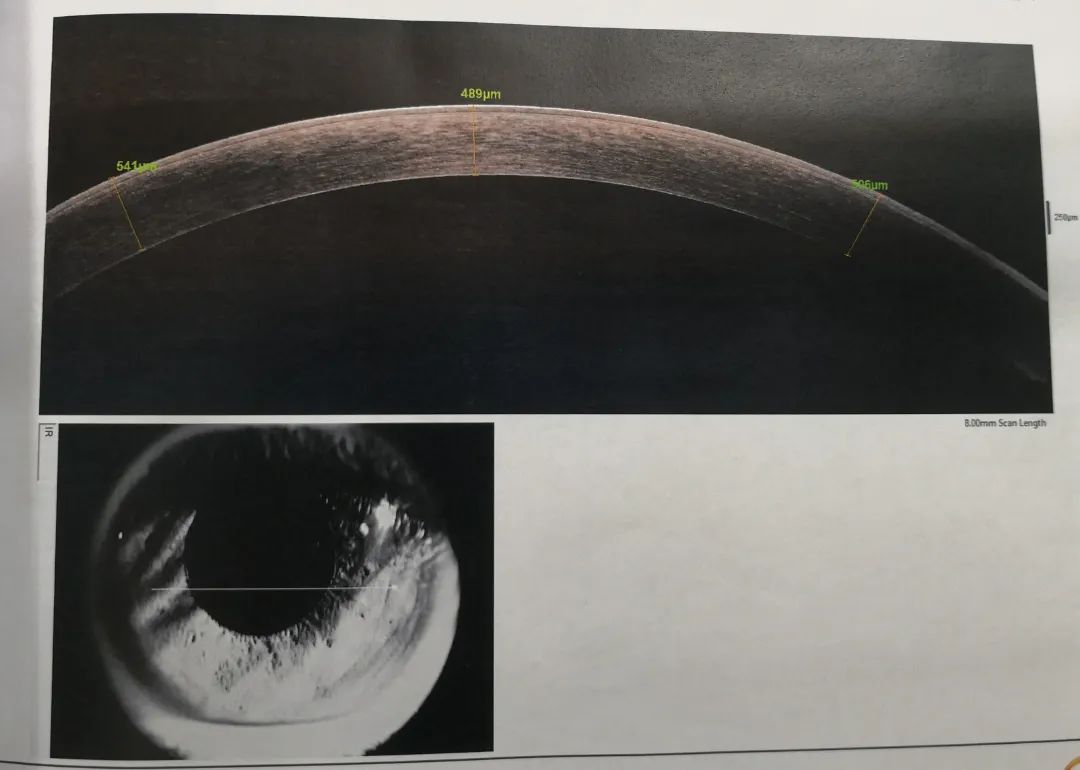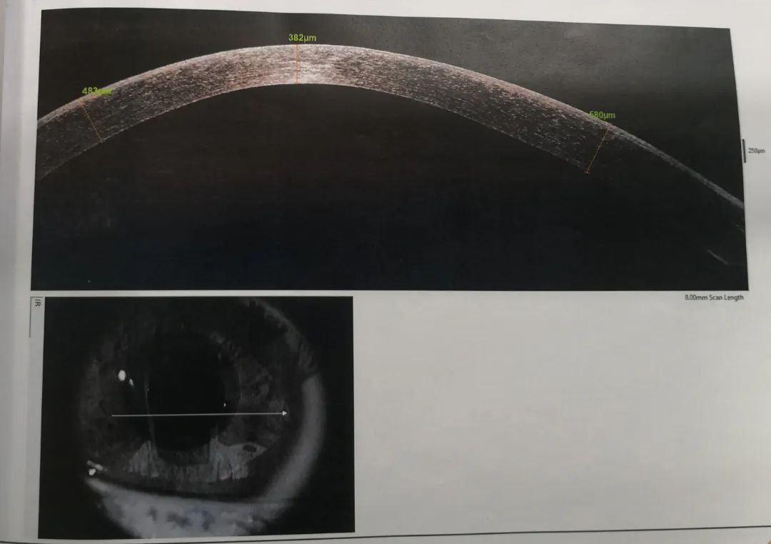 小雨重新回憶起之前的診治經(jīng)歷,確定此前的檢查中并沒(méi)有圓錐角膜的檢查,羅順榮副主任為她完善了相關(guān)檢查。檢查結(jié)果顯示,小雨左眼還是圓錐角膜初期,但右眼已經(jīng)是圓錐角膜的完成期,左眼角膜厚度為489μm,而右眼僅剩下382μm。