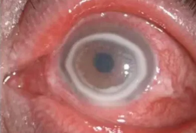 眼表與角膜病科學(xué)科帶頭人吳護(hù)平主任醫(yī)師在初診時(shí),發(fā)現(xiàn)蘇師傅左眼的視力僅有0.3,通過(guò)裂隙燈和角膜熒光染色檢查,可以看到蘇師傅的角膜有明顯的炎癥性病變,炎癥細(xì)胞已經(jīng)浸潤(rùn)到角膜組織中,形成了一個(gè)環(huán)狀浸潤(rùn),角膜上皮大面積破損,出現(xiàn)了水腫和潰瘍。