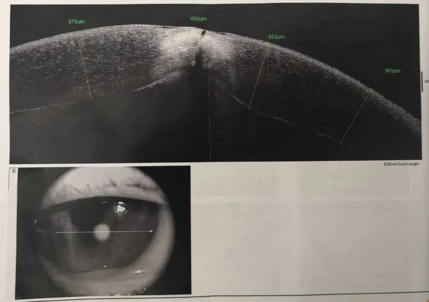 吳護(hù)平主任為小黃安排了詳細(xì)的檢查。經(jīng)過檢查,我們確認(rèn)了小黃為真菌性角膜潰瘍,在小黃角膜中央偏顳下方角膜上可以看到一個約2.2mm的類圓形的灰白色浸潤病灶,遮蓋了部分瞳孔區(qū),深度可達(dá)4/5角膜厚度,同時角膜上皮有缺損,基質(zhì)水腫,表面可以看見少量白色分泌物附著。