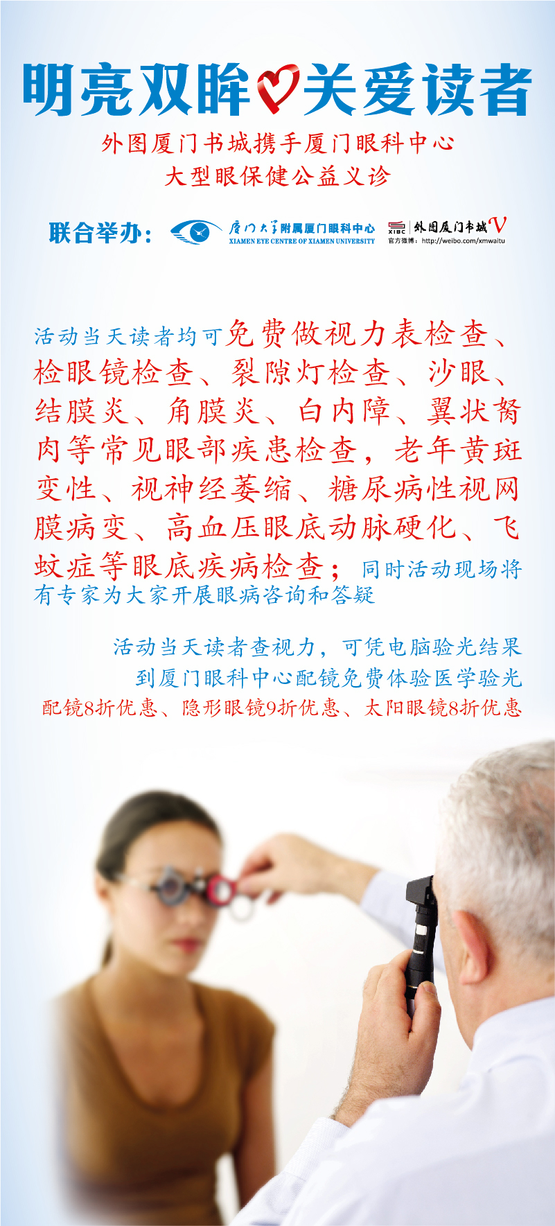 【文章導(dǎo)讀】6月29日(六)9:30-11:30,外圖廈門書城聯(lián)合廈門大學(xué)附屬廈門眼科中心開展明亮雙眸關(guān)愛讀者大型眼保健公益義診,歡迎有需要的讀者參加! 活動(dòng)當(dāng)天讀者均可免費(fèi)做視力表檢查、檢眼鏡