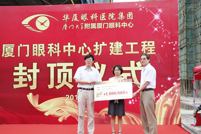 廈門眼科中心的封頂儀式在輕松的氣氛中開始,儀式簡單卻也頗具意義,主辦方將原本用于儀式的預(yù)算節(jié)約下來,并在現(xiàn)場捐贈給廈門市光明基金會。“這是廈門眼科中心也是華廈眼科醫(yī)院集團延續(xù)公益慈善傳統(tǒng)的實際行動。為了響應(yīng)國家規(guī)定,我們在籌辦封頂儀式時堅決反對鋪張,并將原本預(yù)算聯(lián)合其他活動預(yù)算的節(jié)余部分共計100萬元捐入光明基金,用于貧困眼疾患者的手術(shù)費用補助??梢哉f,封頂儀式的舉辦標(biāo)志著我們公益事業(yè)的再邁步。” 華廈眼科醫(yī)院集團業(yè)務(wù)院長侯家敏在采訪中對記者說。