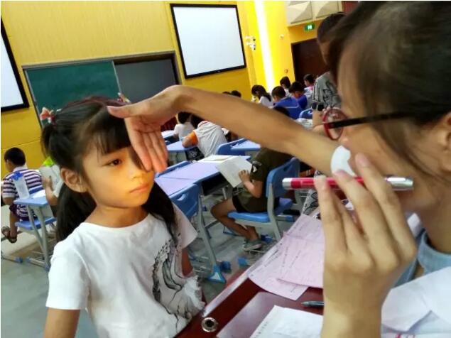 之后,胡護(hù)士和童護(hù)士為學(xué)生們進(jìn)行視力篩查,孩子們按照老師的安排井然有序的參加檢查。檢查后,學(xué)生拿報(bào)告單給賴?yán)蠋熆?,她為每位學(xué)生做簡(jiǎn)單的眼睛檢查,并告訴他們個(gè)人的視力情況。大部分學(xué)生不懂報(bào)告單數(shù)據(jù)的意思,賴?yán)蠋熤鹨荒托牡貫樗麄冎v解各項(xiàng)數(shù)據(jù)的意義。