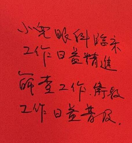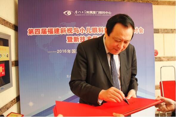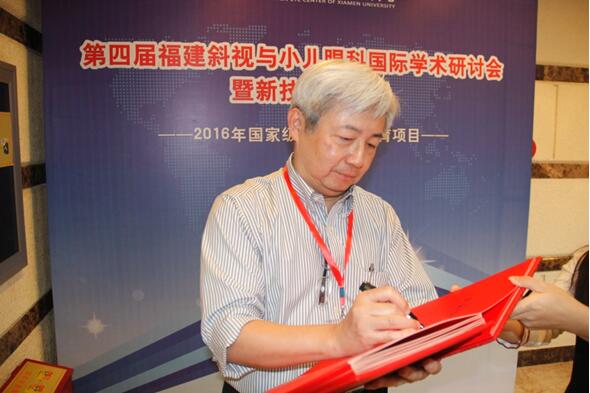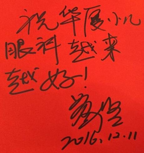 臺(tái)灣斜視與小兒眼科專家王藹侯教授就學(xué)齡前兒童的視覺篩查的經(jīng)驗(yàn)與展望作出演講,旨在讓小兒眼科醫(yī)生能通過篩查,及早發(fā)現(xiàn)和干預(yù)小兒眼病的發(fā)生,并為廈門眼科中心題詞“小兒眼科臨床工作日益精進(jìn),篩查工作、衛(wèi)教工作日益普及”以此勉勵(lì)。