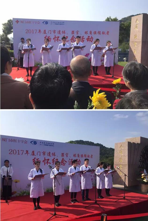 活動(dòng)中,廈門大學(xué)附屬?gòu)B門眼科中心醫(yī)務(wù)工作者們帶來了《生命的禮物》的詩(shī)朗誦表演,表達(dá)了對(duì)捐獻(xiàn)者無(wú)償獻(xiàn)出珍貴“生命禮物”的崇敬與感恩之情。廈門大學(xué)醫(yī)學(xué)院青年志愿者協(xié)會(huì)在紀(jì)念碑前宣誓并遞上了獻(xiàn)花。捐獻(xiàn)者紀(jì)念碑前,手捧白菊的人群中,有蹣跚而行的白發(fā)老人,有一臉稚氣的年幼孩童,更多的是中年人和青年人。人群中,有人哭泣,有人默默佇立,一遍遍撫摸著刻在紀(jì)念碑上親人的名字。