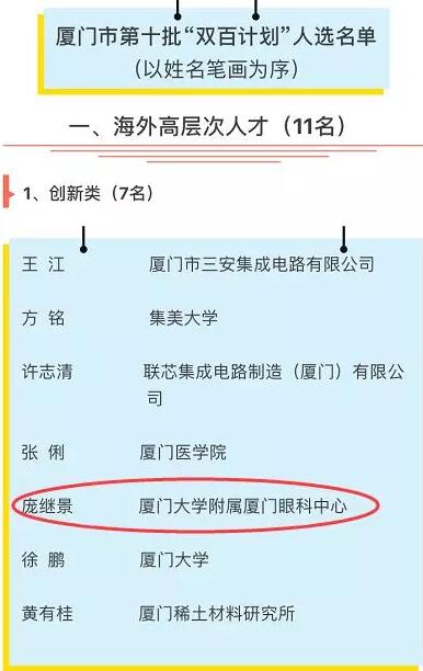 2018年1月25日,廈門市第十批引進(jìn)高層次人才“雙百計(jì)劃”人選名單的公告及名單正式公布!歷經(jīng)半年時(shí)間申報(bào)、初審、網(wǎng)絡(luò)評審、現(xiàn)場答辯、市高層次人才引進(jìn)專項(xiàng)小組會(huì)議研究和公示等層層篩選,最終世界眼遺傳病基因治療專家、華廈