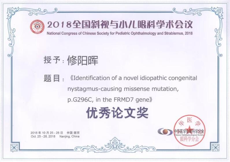 ◆ 廈門眼科中心斜視與小兒眼科修陽(yáng)暉博士撰寫的關(guān)于先天性眼球震顫致病基因的論文《Identification of a novel idiopathic congenital nystagmus-causing missense mutation, p.G296C, in the FRMD7 gene》榮獲大會(huì)十佳“優(yōu)秀論文獎(jiǎng)”。