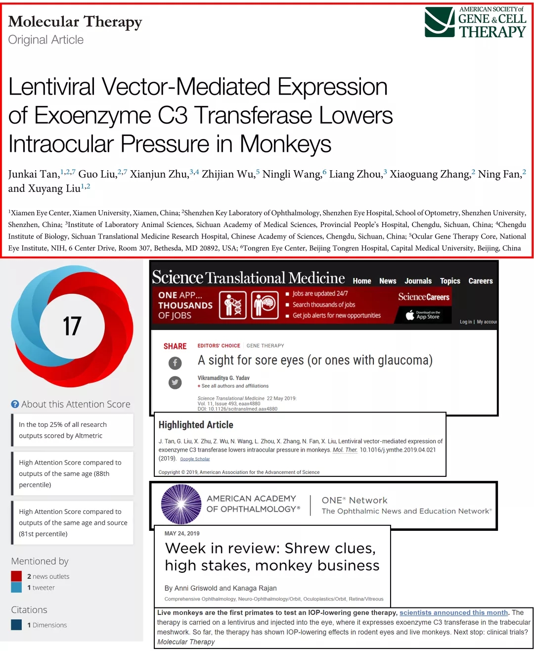 該項研究是以非人靈長類動物恒河猴為實驗對象,應用失活病毒作為載體,將有利于房水排出的基因導入猴眼小梁(主要房水排出通道),能引起長達112天的眼壓下降,并且未見不良反應。此前,成功地將功能基因導入猴眼小梁組織并發(fā)揮降眼壓作用尚未見報道。隨即國際雜志《Science Translational Medicine》(影響因子18分)推薦了該篇研究論文,接著美國眼科學會(AAO)官方網站對其進行了報道,兩者均認為此項研究有較好的學術價值和臨床應用前景。目前該篇文章的Altmetric評分(社會化影響力)為17。這是繼近年來年劉旭陽教授團隊在發(fā)表多篇系列研究論文(如去年的美國IOVS雜志)后的又一成果展示,標志著該團隊在青光眼基因治療方面的工作正在穩(wěn)步發(fā)展。目前該團隊的相關工作仍在繼續(xù),比如用改進的基因治療方法已經降低猴眼壓達10個月以上,新的文章已經投稿,并有望于今年發(fā)表。