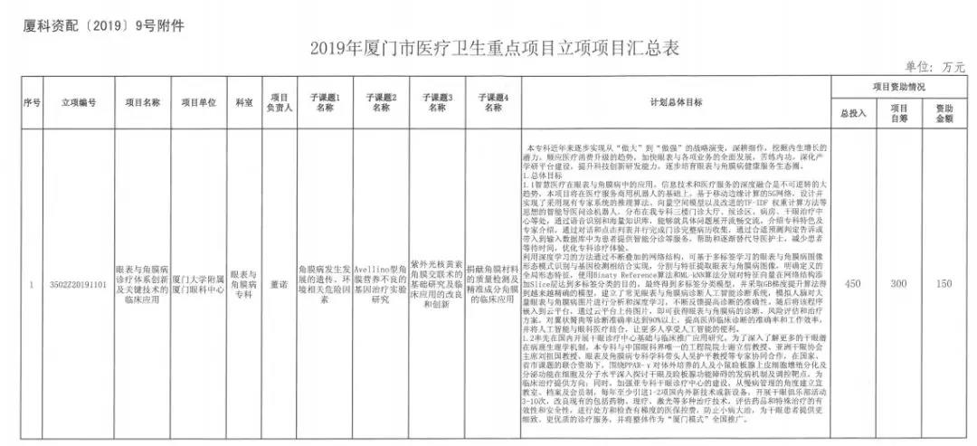 2019年廈門(mén)市醫(yī)療衛(wèi)生重點(diǎn)項(xiàng)目評(píng)選結(jié)果出爐啦!經(jīng)過(guò)層層嚴(yán)格評(píng)選、考核、調(diào)研廈門(mén)眼科中心眼表與角膜病專科申報(bào)項(xiàng)目獲批“市級(jí)醫(yī)療衛(wèi)生重點(diǎn)項(xiàng)目”同時(shí)獲撥資助基金150萬(wàn)元項(xiàng)目,總投入450萬(wàn)元!