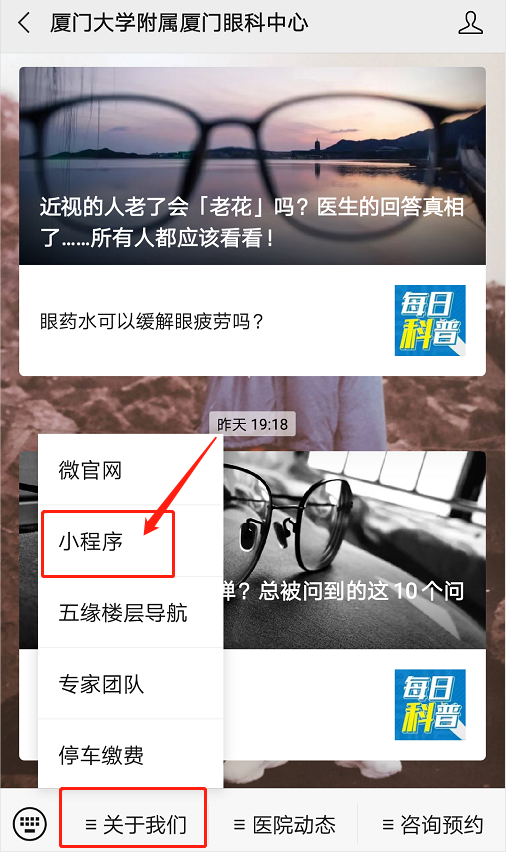 在微信小程序中搜索“廈門(mén)眼科中心”,或在微信公眾號(hào)點(diǎn)擊“小程序”進(jìn)行自助預(yù)約。