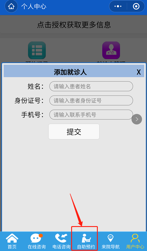 “就診人管理”-“添加信息”-“自助預(yù)約”