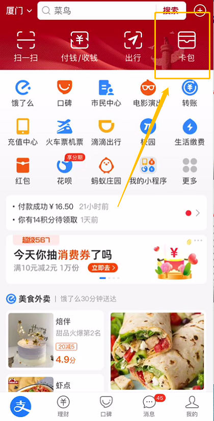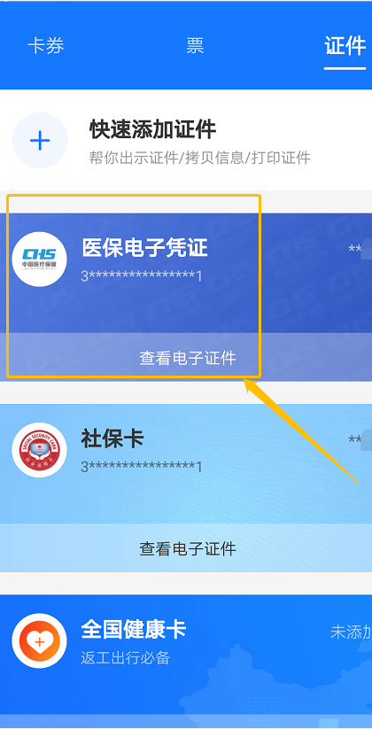 進(jìn)入支付寶,點擊“卡包”-“證件”-“醫(yī)保電子憑證”
