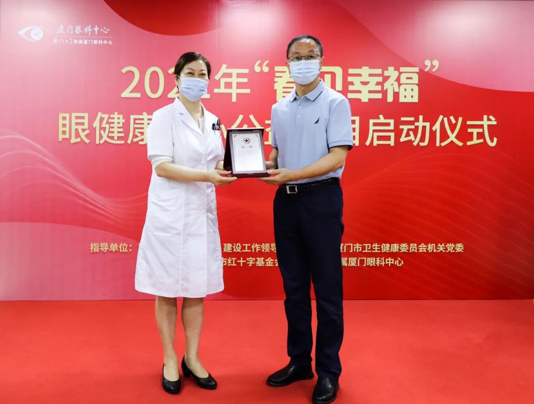▲ 廈門市紅十字會代表為廈門大學(xué)附屬廈門眼科中心頒發(fā)“中國紅十字奉獻(xiàn)獎?wù)?rdquo;及“福建省紅十字人道金質(zhì)獎?wù)?rdquo;
