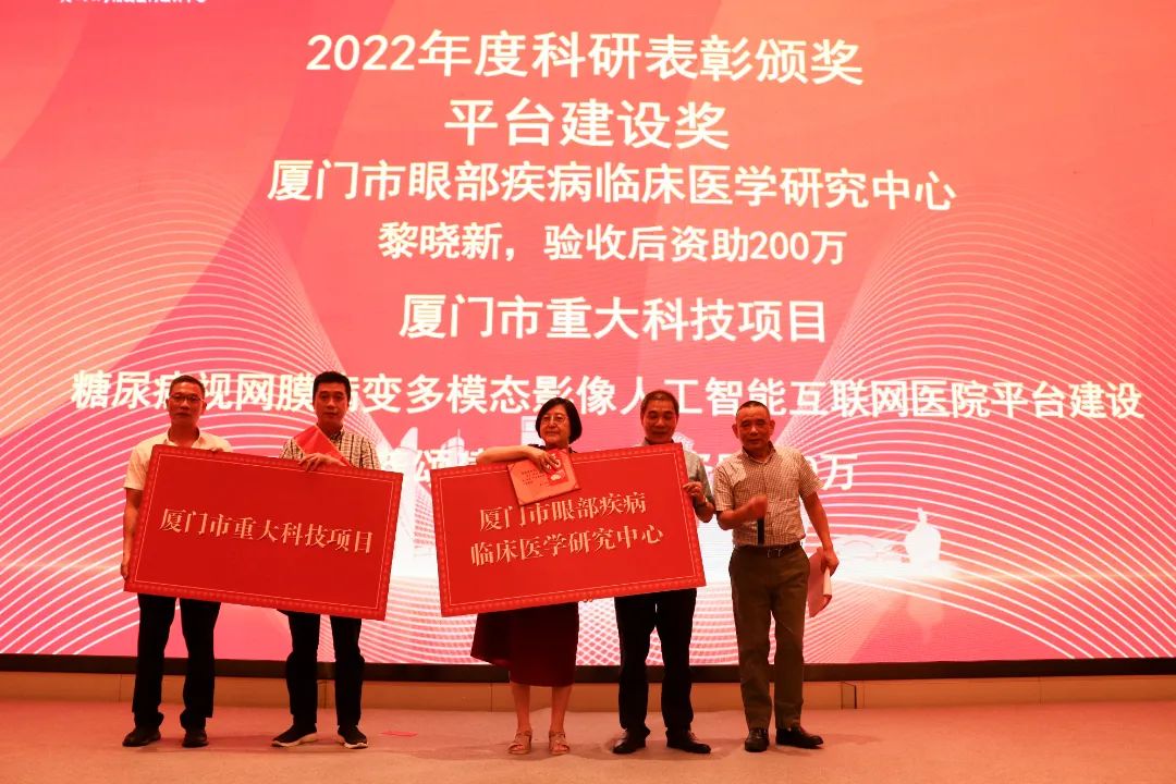 會上,2022年度科研表彰頒獎盛典同步舉行。2022年度,我院科研工作再結(jié)碩果,醫(yī)院學術(shù)品牌的影響力和號召力得到進一步提升。我院獲批成為廈門市眼部疾病臨床醫(yī)學研究中心,榮登2022年度中國醫(yī)院科技量值(眼科學)榜單,并連續(xù)十年衛(wèi)冕福建省眼科學第 一,實力領(lǐng)跑。