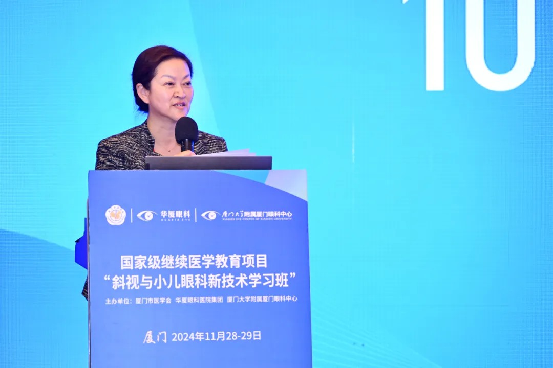 ▲ 廈門眼科中心業(yè)務(wù)副院長(zhǎng)、斜視與小兒眼科學(xué)科帶頭人潘美華教授主持開(kāi)幕式