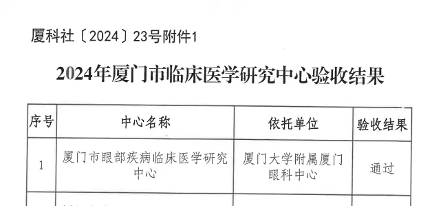 廈門眼科中心2025年度【文章導(dǎo)讀】日前,廈門市科學(xué)技術(shù)局對(duì)廈門市5家疾病臨床醫(yī)學(xué)研究中心開展了驗(yàn)收,經(jīng)過層層嚴(yán)格評(píng)選、現(xiàn)場(chǎng)答辯和實(shí)地考察后,我院建設(shè)的眼部疾病臨床醫(yī)學(xué)研究中心成功通過驗(yàn)收! 廈門市眼