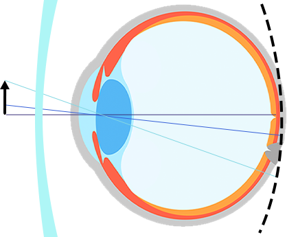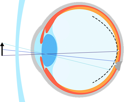 周邊離焦鏡片通過將投射在視網(wǎng)膜后面周邊的焦點(diǎn),移到視網(wǎng)膜上或視網(wǎng)膜前方,我們稱之為聚焦或周邊近視性離焦: