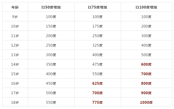 我們來做一個假設(shè),如果一個9歲的孩子近視100度,分別以每年50度、75度、100度的近視度數(shù)增長,結(jié)果竟然不到18歲,就已經(jīng)發(fā)展成了高度近視。