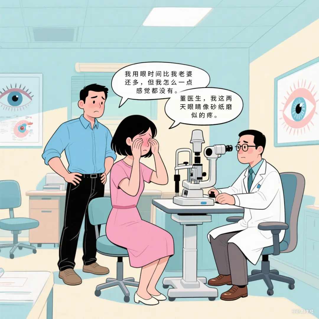 剛結束加班的設計師麗麗不停揉著發(fā)紅的眼睛:"董醫(yī)生,我這兩天眼睛像砂紙磨似的疼。"而陪她來的程序員丈夫阿強插話:"我用眼時間比我老婆還多,但我怎么一點感覺都沒有。"