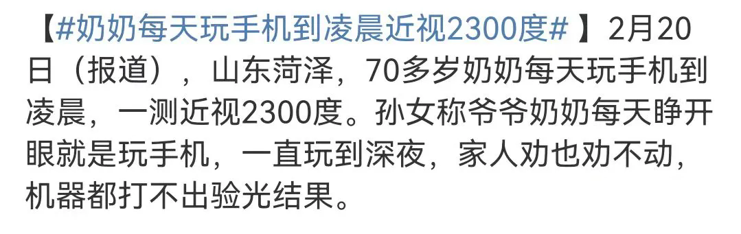2月20日,山東菏澤發(fā)生了一起引人關(guān)注的健康事件:一位70多歲的老奶奶因長時間沉迷手機(jī),導(dǎo)致近視度數(shù)竟高達(dá)2300度。