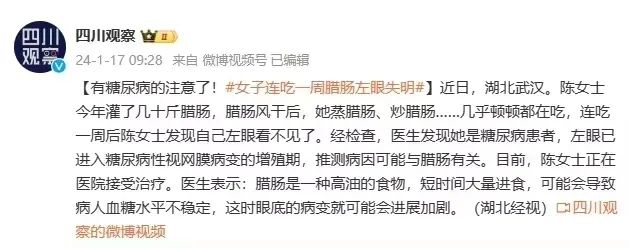 近日,湖北武漢陳女士連吃一周臘腸后左眼失明,經(jīng)檢查確診糖尿病視網(wǎng)膜病變,并且已經(jīng)進(jìn)入增殖期。
