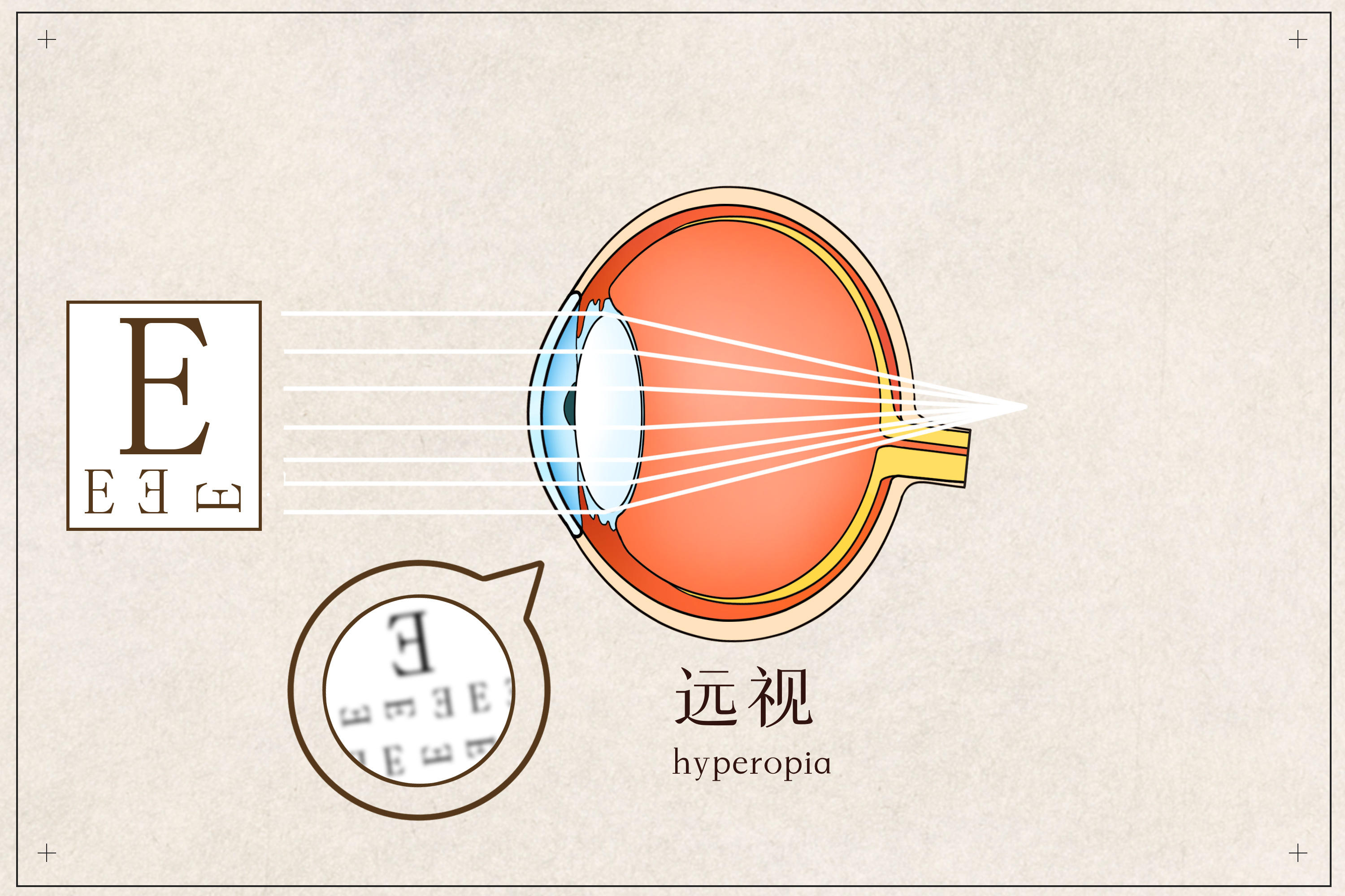 遠視是指平行光線進入眼內,經(jīng)過眼球屈光系統(tǒng)(角膜、房水、晶狀體、玻璃體)的折射,在視網(wǎng)膜后方聚焦,導致視網(wǎng)膜上的成像模糊不清,稱為遠視眼。